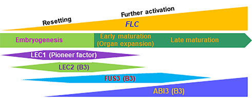 該項(xiàng)研究與該團(tuán)隊(duì)之前的研究揭示了種子特異的LAFL基因調(diào)控網(wǎng)絡(luò)(LEC1、LEC2、FUS3和ABI3)在重置“春化記憶”過(guò)程中的關(guān)鍵作用。LEC1作為先鋒轉(zhuǎn)錄因子,通過(guò)提高FLC染色體的開(kāi)放度促進(jìn)B3轉(zhuǎn)錄因子 (LEC2、FUS3和ABI3) 結(jié)合CME序列;另外,B3轉(zhuǎn)錄因子之間具有部分冗余性。該研究對(duì)于理解植物的環(huán)境響應(yīng)和表觀遺傳印記重置具有重要意義,并揭示了激素對(duì)胚成熟過(guò)程中FLC表達(dá)的進(jìn)一步激活發(fā)揮重要作用。