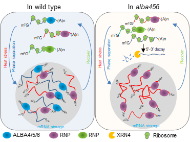 總的來(lái)說(shuō),該工作發(fā)現(xiàn)當(dāng)植物受到高溫脅迫時(shí),ALBA蛋白結(jié)合包括HSF mRNAs在內(nèi)的一系列mRNAs,通過(guò)相分離招募這些mRNAs進(jìn)入應(yīng)激顆粒和加工小體中,保護(hù)HSF mRNAs在高溫條件下不被降解。在alba456突變體中,HSF mRNA不能被有效的招募進(jìn)入應(yīng)激顆粒和加工小體中保護(hù)起來(lái),因此在細(xì)胞質(zhì)中被XRN4從5′到3′降解,造成植物的耐熱性下降(圖一)。這一研究結(jié)果對(duì)于深入理解植物耐熱性的分子機(jī)制和應(yīng)激顆粒的生物學(xué)功能具有重要作用。
