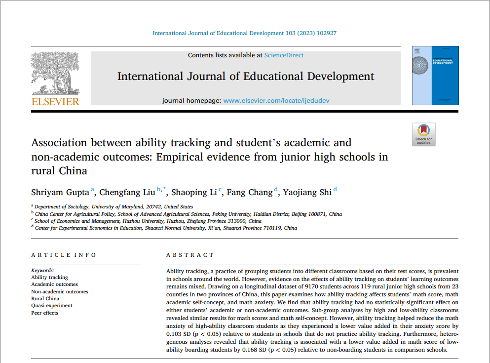 11月7日,國際學(xué)術(shù)期刊International Journal of Educational Development在線發(fā)表了北京大學(xué)現(xiàn)代農(nóng)學(xué)院副院長、中國農(nóng)業(yè)政策研究中心副主任劉承芳教授與合作者的研究論文“Association between ability tracking and student’s academic and non-academic outcomes: Empirical evidence from junior high schools in rural China”。
