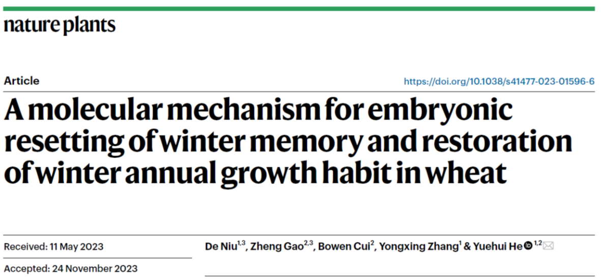 3. Niu, D., Gao, Z., Cui, B., Zhang, Y. and He, Y. A molecular mechanism for embryonic resetting of winter memory and restoration of winter annual growth habit in wheat. (2024) Nat. Plants, https://doi.org/10.1038/s41477-023-01596-6.