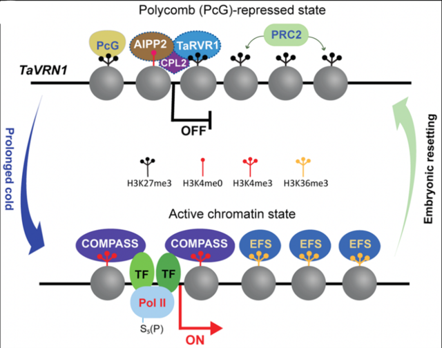 被子植物的生命周期中,從營養(yǎng)生長到生殖生長(開花)的轉(zhuǎn)變是一個(gè)至關(guān)重要的發(fā)育過程,也是農(nóng)作物的重要農(nóng)藝性狀,成花轉(zhuǎn)變直接影響著農(nóng)作物的產(chǎn)量和質(zhì)量。冬小麥為主要糧食作物,廣泛種植于溫帶地區(qū)。冬麥在秋天播種,以幼苗越冬,需要經(jīng)歷長時(shí)間的持續(xù)低溫(冬季低溫)才能獲得在來年春季開花的潛力(春化作用)。春化作用賦予冬小麥“越冬記憶”,確保春季氣溫變暖后,植物在營養(yǎng)生長后期及時(shí)轉(zhuǎn)變至生殖生長(開花),但開花結(jié)實(shí)后產(chǎn)生的下一代又需要越冬才能獲得開花的潛力。這樣,每一代冬小麥都需要經(jīng)歷冬季持續(xù)低溫,才能在春天開花結(jié)實(shí)。