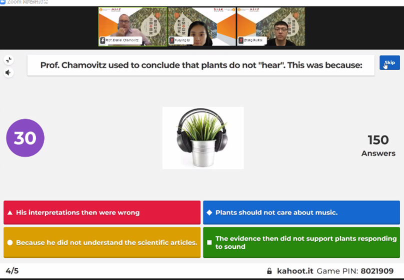 目前,Daniel Chamovitz教授每年在全球范圍內(nèi)只上這一門課。作為一名經(jīng)驗豐富的教授,Daniel教授精心準備了相關(guān)的課程視頻及課件。另外,為了實時了解同學們的學習情況及問題,Daniel采用了kahoot線上答題的方式,極大的增加了老師和同學們的互動,同學們的學習興趣也更加濃厚。在每次課程快結(jié)尾的時候,都會讓同學們通過簡單的小測試來了解自己的學習情況。針對同學們的問題,Daniel和助教都會耐心地在線上回答,并引發(fā)大家的討論。