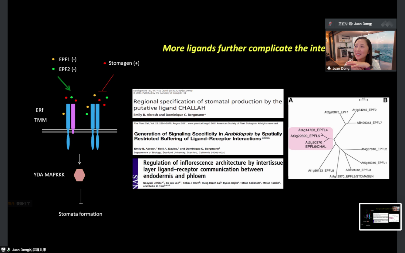 第一天的暑期課程由林辰濤老師主持,董娟老師主講。林老師向大家簡(jiǎn)要介紹了課程的歷史以及本期課程邀請(qǐng)的諸位老師及授課主題,之后董老師帶領(lǐng)大家走進(jìn)植物發(fā)育過(guò)程中的細(xì)胞生物學(xué)領(lǐng)域。上午的課程中,老師講解了植物氣孔發(fā)育的相關(guān)內(nèi)容,重點(diǎn)講解了氣孔細(xì)胞發(fā)育進(jìn)程中3個(gè)核心轉(zhuǎn)錄因子SPCH、MUTE和FAMA的發(fā)現(xiàn)過(guò)程以及作用機(jī)制, 介紹了在感知環(huán)境變化及細(xì)胞間的交流中配體與受體結(jié)合向下游傳遞氣孔發(fā)育信號(hào)的多樣性,如即使是同一個(gè)receptor,TMM,在植物不同的發(fā)育部位對(duì)氣孔發(fā)育的調(diào)控也是不同。