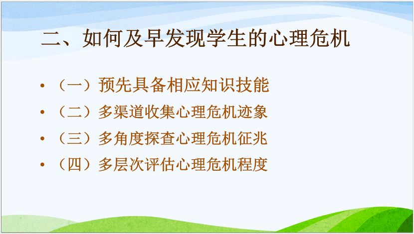 莊明科老師表示,學(xué)生心理危機(jī)具有成長性、階段性和自愈性的特點(diǎn)。要?及早發(fā)現(xiàn)學(xué)生的心理危機(jī),必須?預(yù)先具備相應(yīng)知識技能,多渠道收集心理危機(jī)跡象,?多角度探查心理危機(jī)征兆,?多層次評估心理危機(jī)程度。