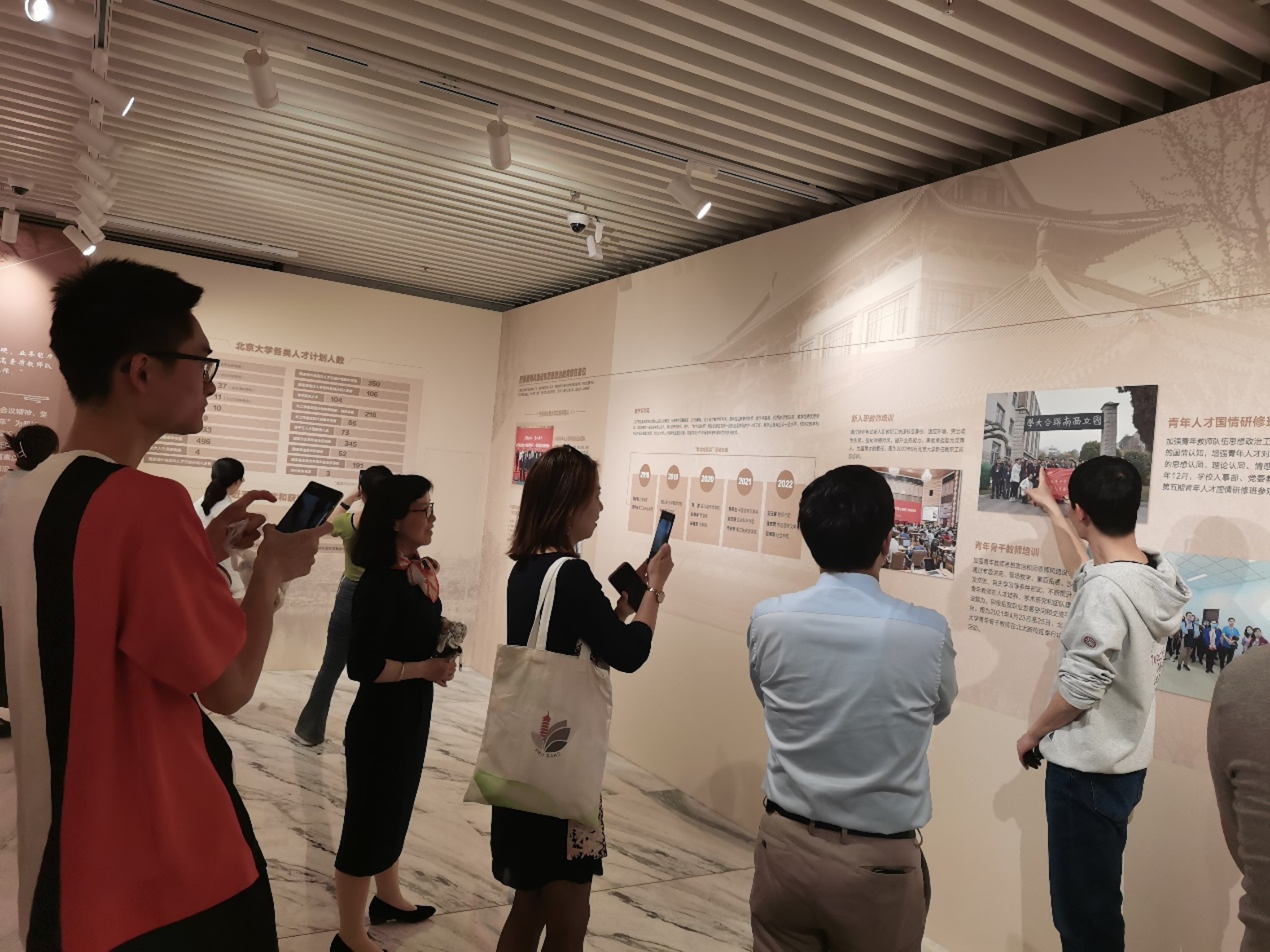 展覽選取了習(xí)近平總書記“5·2”重要講話中“同人民一起開拓 同祖國一起奮進(jìn)”作為主題,緊密圍繞習(xí)近平總書記“5·2”重要講話內(nèi)容,全面展現(xiàn)近年來北京大學(xué)勇?lián)姑㈨频Z前行,開創(chuàng)高等教育高質(zhì)量發(fā)展新局面、推進(jìn)中國特色世界一流大學(xué)建設(shè)進(jìn)程的發(fā)展建設(shè)成就,回顧了北京大學(xué)建校125年來全面引領(lǐng)、推動和融入中國式現(xiàn)代化進(jìn)程的相關(guān)重要?dú)v史場景。