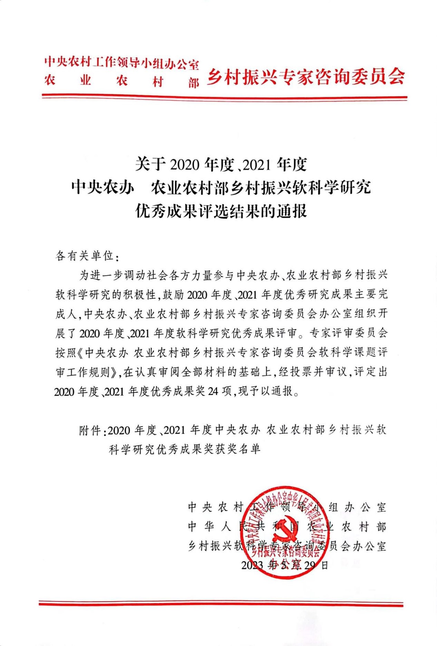 據(jù)悉,此次評選旨在進一步調(diào)動社會各方力量參與中央農(nóng)辦、農(nóng)業(yè)農(nóng)村部鄉(xiāng)村振興軟科學研究的積極性,鼓勵2020年度、2021年度優(yōu)秀研究成果主要完成人。經(jīng)過專家評審委員會的認真審閱、投票和審議,共評選出優(yōu)秀成果獎24項。
