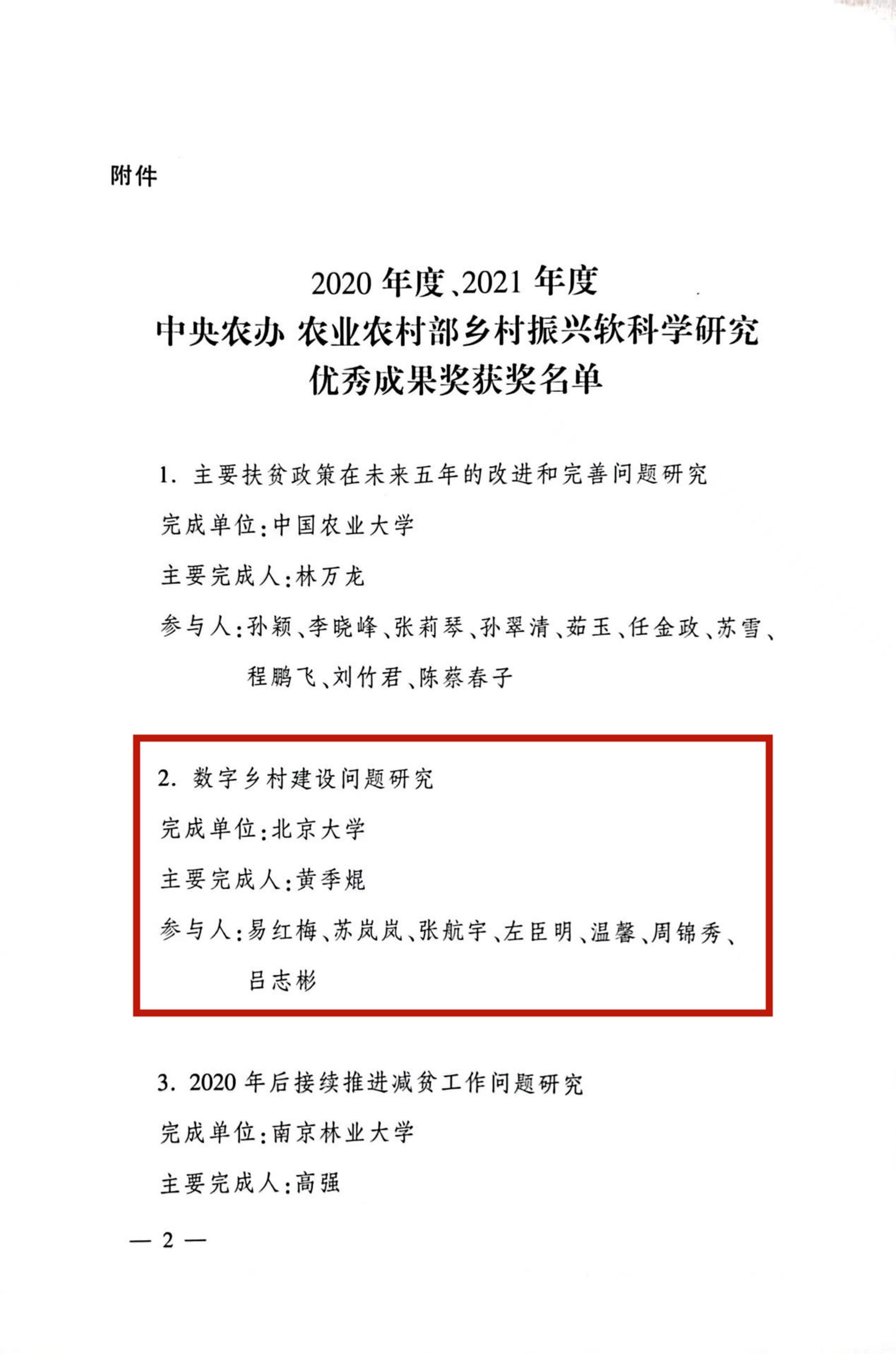 近日,中央農(nóng)村工作領導小組辦公室、鄉(xiāng)村振興專家咨詢委員會、農(nóng)業(yè)農(nóng)村部發(fā)布了2020年度、2021年度中央農(nóng)辦農(nóng)業(yè)農(nóng)村部鄉(xiāng)村振興軟科學研究優(yōu)秀成果評選結(jié)果。北京大學新農(nóng)村發(fā)展研究院“數(shù)字鄉(xiāng)村建設問題研究”課題在評選中榮獲優(yōu)秀成果獎。