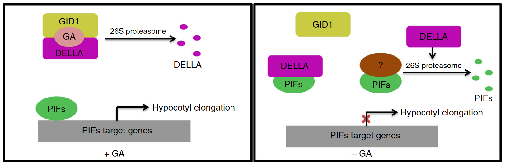 植物發(fā)育同時(shí)受到外源環(huán)境和內(nèi)源激素的調(diào)控。光和赤霉素分別是極其重要的環(huán)境因子和植物激素,它們都調(diào)控了植物的多個(gè)發(fā)育過程。光抑制植物胚軸的伸長(zhǎng),赤霉素卻促進(jìn)其伸長(zhǎng),兩者作用相反。2008年,鄧興旺實(shí)驗(yàn)室發(fā)表在《Nature》雜志上的研究工作“Coordinated regulation of Arabidopsis thaliana development by light and gibberellins”表明,赤霉素信號(hào)通路中的核心抑制因子DELLA蛋白可以通過與能促進(jìn)胚軸延伸的光信號(hào)核心轉(zhuǎn)錄因子PIF3相互作用,抑制PIF3結(jié)合到下游靶基因的啟動(dòng)子上,從而抑制植物胚軸伸長(zhǎng)。由此,光可以通過促進(jìn)PIF3蛋白降解來抑制胚軸伸長(zhǎng),赤霉素則通過降解DELLA蛋白進(jìn)而釋放PIF3來促進(jìn)胚軸伸長(zhǎng)。然而,DELLA與PIFs蛋白之間是否還存在其他層次的調(diào)控機(jī)制并不清楚。