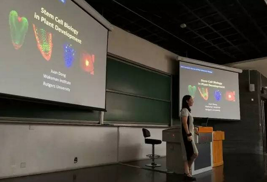 課程第三天,來自美國羅格斯大學瓦克斯曼研究所的董娟教授,同時也是在這次暑期課程創(chuàng)辦伊始就加入到授課隊伍的老師之一,帶大家走進植物發(fā)育的干細胞生物學。細胞不對稱分裂可以讓發(fā)育因子不對稱分配在兩個子細胞,是干細胞分化成不同細胞類群的重要機制。長久以來的研究表明,動物細胞的不對稱分裂是由一些保守的蛋白通過極化定位而實現的。然而,在植物中并不存在相應的同源極化蛋白,植物的細胞不對稱分裂是如何發(fā)生的,一直是植物發(fā)育生物學領域尚未解決的謎題。董娟教授在美國斯坦福大學從事博士后研究期間,通過擬南芥葉表皮氣孔細胞突變體的遺傳篩選,分離到一個新的基因BASL,首次闡釋了BASL蛋白極化定位介導表皮細胞不對稱分裂的分子機制。此后,董娟教授到羅格斯大學獨立開展研究,繼續(xù)圍繞植物細胞不對稱分裂的科學問題,做出了一系列出色的工作。