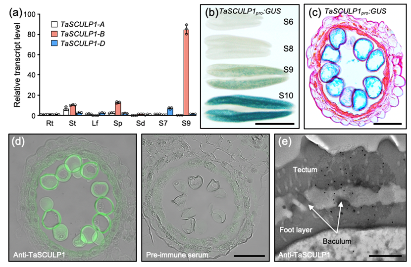 該研究通過比較轉(zhuǎn)錄組的方法鑒定到種子植物中保守的、小孢子特異表達(dá)的多銅氧化酶SCULP(SKS clade universal in pollen)。選取小麥TaSCULP1進(jìn)行表達(dá)模式分析,發(fā)現(xiàn)其在單核期和二核期小孢子外壁特異表達(dá)(圖1),這是已知孢粉素前體聚合階段,也與小孢子對銅元素的關(guān)鍵需求時期相吻合。純化的TaSCULP1可以結(jié)合孢粉素酚類單元對香豆酸,通過遺傳、化學(xué)分析和三維重構(gòu)證明TaSCULP1是孢粉素對香豆酰化和小麥花粉外壁基粒棒結(jié)構(gòu)的起始與生長以及花粉成熟所必需的(圖2)。以上結(jié)果揭示了孢粉素前體聚合過程中的小孢子自主功能,為花粉外壁圖案形成和孢粉素生物工程合成奠定了基礎(chǔ)。
