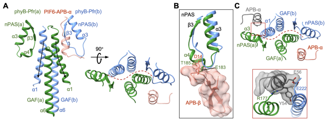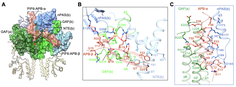 圖4. phyB-Pfr的N末端結(jié)構(gòu)域?qū)?/span>PIF-APB的特異性識(shí)別(A)以及NTE結(jié)構(gòu)域特異性識(shí)別PIF-APB的N末端β發(fā)夾結(jié)構(gòu)(B),phyB-Pfr二聚體特異性識(shí)別PIF-APB的C末端α螺旋結(jié)構(gòu)(C)