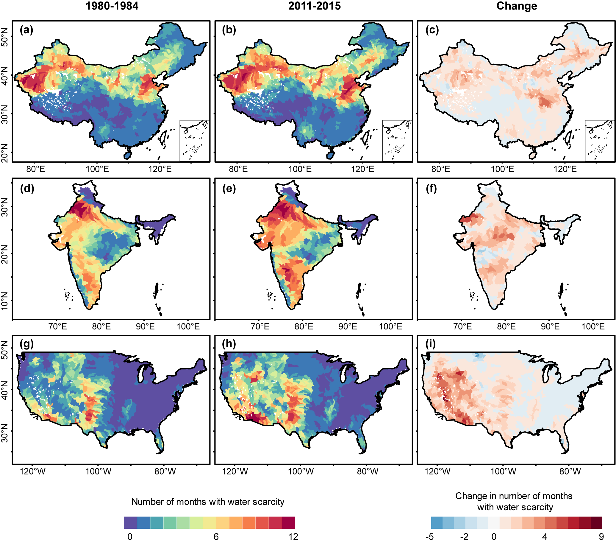 利用不可持續(xù)藍水需求的時空演變識別出缺水加劇的熱點地區(qū)。當前,中國、印度和美國每年缺水時間超過四個月的地區(qū)分別占32%、61%和27%。而在不可持續(xù)藍水需求增加的71%(中國)、71%(印度)和56%(美國)的子流域中,總用水需求增加得更快,即用水需求增加(而不是水資源供應減少)是這些地方水資源短缺加劇的主要原因。
