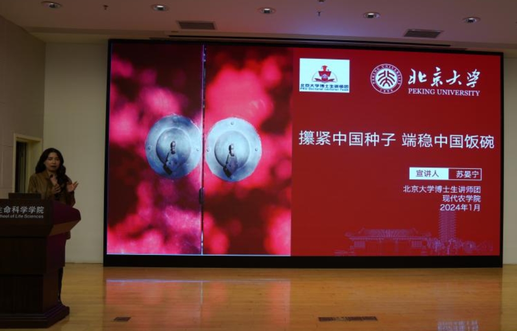 一次偶然的機(jī)會,蘇晏寧接觸到了“博士生講師團(tuán)”這個集體,帶著“走出去,看一看”的想法,她參與到第三期北京大學(xué)青年宣講骨干人才培訓(xùn)計劃中。起初,做為少數(shù)理科生甚至唯一生命科學(xué)方向成員的她,時常對自己“理論知識不充分、專業(yè)知識不匹配”感到不自信,但在朋輩導(dǎo)師的鼓勵和幫助下,蘇晏寧結(jié)合自己的專業(yè)課題,生動地闡述了雜交水稻對于我國糧食安全的重要意義,打磨出了《攥緊中國種子,端穩(wěn)中國飯碗》的主題宣講課程。課程講述了中國從“吃不飽”到“吃得飽”再到“吃得好”的非凡歷程,詳細(xì)分析了中國在糧食安全領(lǐng)域的戰(zhàn)略布局以及在國際舞臺上的挑戰(zhàn)與機(jī)遇。