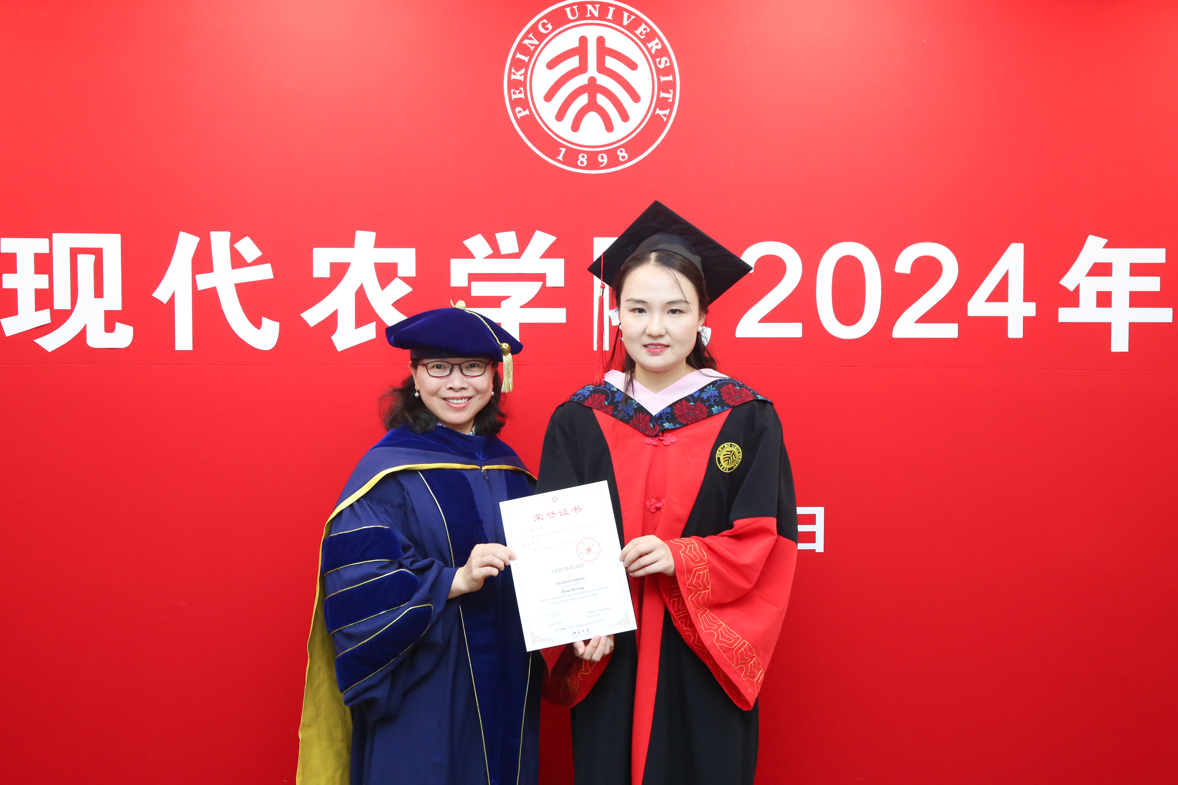 畢業(yè)生王雪融和丁雅文獲評2023-2024年度北京大學優(yōu)秀畢業(yè)生,王雪融同時獲評北京市優(yōu)秀畢業(yè)生。現(xiàn)代農學院副院長、黨總支副書記劉承芳教授為她們頒發(fā)獲獎證書,祝賀她們取得優(yōu)異成績。