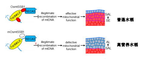 在剛剛發(fā)表的論文中,他們發(fā)現(xiàn)ta1的糊粉層厚度約為野生型的2倍,且增加的糊粉層由亞糊粉層細(xì)胞發(fā)育而來。圖位克隆結(jié)果表明,ta1糊粉層加厚的表型是由OsmtSSB1基因突變引起。該基因編碼一個定位于線粒體的單鏈DNA結(jié)合蛋白,在穎果的糊粉層、亞糊粉層和胚胎中高表達(dá),而在淀粉胚乳中不表達(dá)。進(jìn)一步實驗發(fā)現(xiàn)OsmtSSB1-GFP定位于線粒體,具有特異的單鏈DNA結(jié)合活性。OsmtSSB1蛋白可分別與線粒體重組酶RECA3和DNA解旋酶TWINKLE互作。在野生型植物中用RNA干擾的技術(shù)降低RECA3或TWINKLE的表達(dá)可以模擬ta1糊粉層加厚表型。此外,ta1糊粉層細(xì)胞線粒體的異常DNA重組增加,電子傳遞鏈復(fù)合體I的含量及其NADH脫氫酶活性降低,導(dǎo)致胚乳中線粒體形態(tài)異常和ATP含量降低。由此他們推測OsmtSSB1可能是通過與RECA3和TWINKLE相互作用,抑制水稻糊粉層細(xì)胞線粒體基因組DNA異常重組,維持線粒體有效的能量供應(yīng)。而有效的能量供給是亞糊粉層細(xì)胞分化為淀粉胚乳細(xì)胞所必須的。