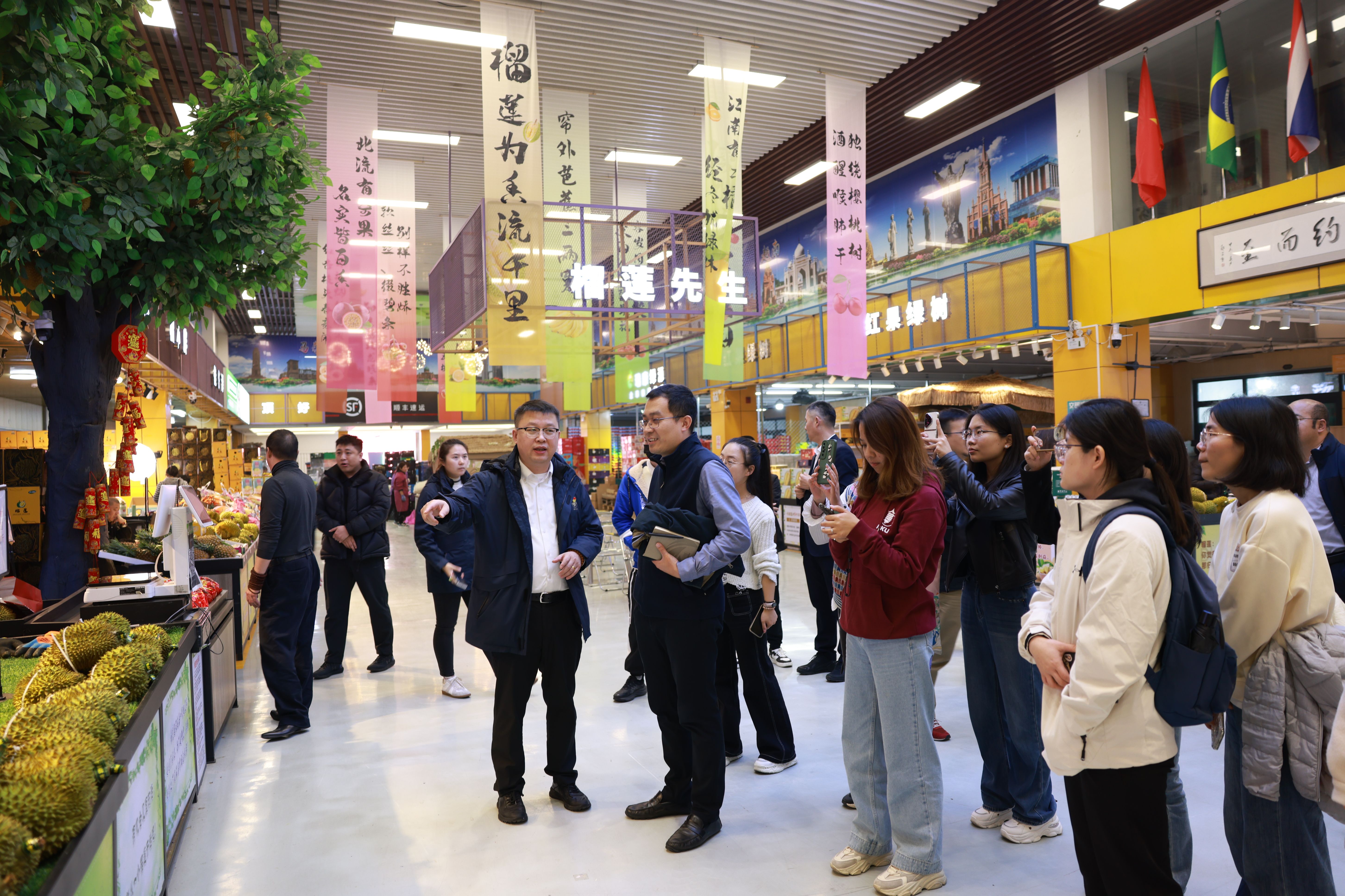 隨后,學(xué)院黨員師生一行又來到了國際榴蓮館。新發(fā)地積極推動(dòng)轉(zhuǎn)型升級(jí),業(yè)務(wù)穩(wěn)步向生產(chǎn)源頭和零售終端同步延伸, “國際榴蓮館”就是改造升級(jí)的成果之一,這里匯聚了來自馬來西亞、泰國、越南、菲律賓等世界各國的榴蓮,同時(shí)設(shè)有休閑體驗(yàn)、批發(fā)銷售、直播帶貨和商務(wù)洽談等功能,形成了全新農(nóng)產(chǎn)品體驗(yàn)式交易模式。榴蓮館參觀體現(xiàn)了新發(fā)地在全球農(nóng)產(chǎn)品供應(yīng)鏈中的重要地位,也讓師生們對(duì)新發(fā)地的國際化業(yè)務(wù)有了更深入的認(rèn)識(shí)。