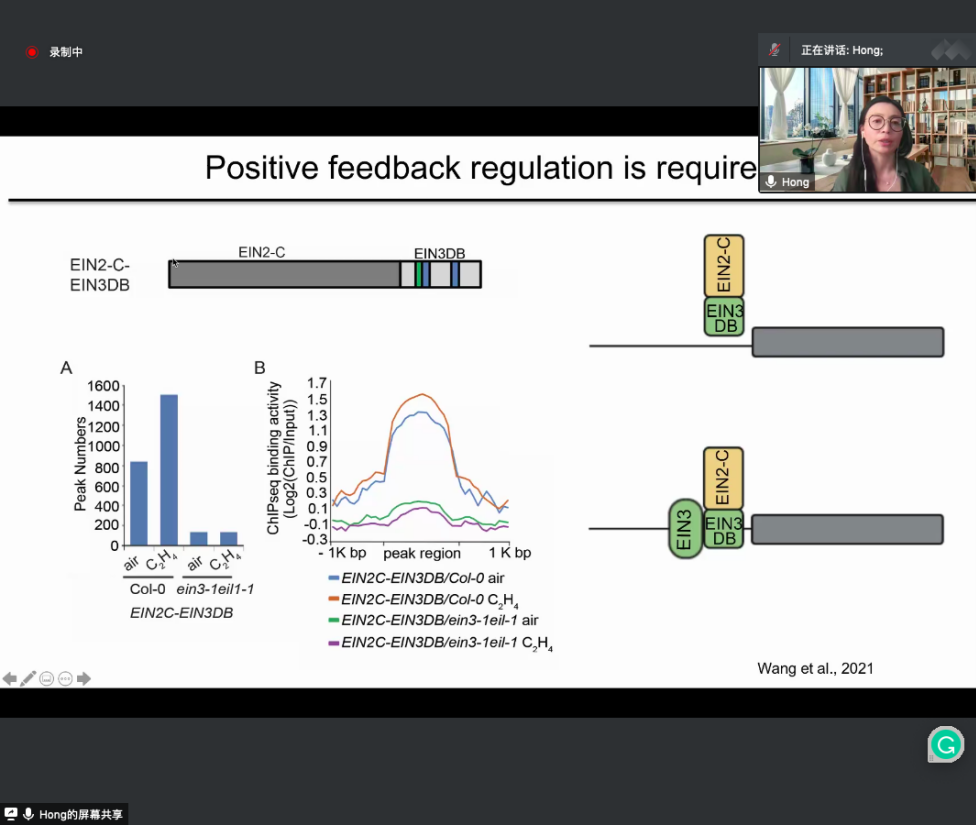上午的研討會(huì)由林辰濤老師主持。首先由王志勇老師為大家講述糖和植物激素對(duì)植物生長(zhǎng)發(fā)育的調(diào)控,主要介紹了負(fù)責(zé)蛋白糖基化修飾的SPY和SEC所介導(dǎo)的GA和BR信號(hào)轉(zhuǎn)導(dǎo)機(jī)制及其對(duì)植物生長(zhǎng)發(fā)育的影響。此外王老師也列舉了研究中鑒定到的大量SPY和SEC的互作蛋白,涉及了根的發(fā)育、晝夜節(jié)律、開(kāi)花、植物免疫等多個(gè)方面,也包括植物激素、環(huán)境信號(hào)等多種內(nèi)外界信號(hào)途徑的因子,暗示了糖信號(hào)以及糖基轉(zhuǎn)移酶SPY和SEC對(duì)植物生長(zhǎng)發(fā)育的重要調(diào)控作用,也為其他學(xué)者提供了豐富的研究線(xiàn)索。接著欒升老師介紹了第二信使Ca2+對(duì)植物營(yíng)養(yǎng)吸收的調(diào)控,重點(diǎn)介紹了Ca2+受體CBLs和CIPKs的差異性互作對(duì)于植物鉀吸收的特異性調(diào)控。喬紅老師講述了乙烯信號(hào)轉(zhuǎn)導(dǎo)的表觀調(diào)控機(jī)制,介紹了以EIN2、EIN3為核心的ENAP1及SRT1和SRT2參與的組蛋白乙酰化和去乙酰化過(guò)程,也發(fā)現(xiàn)了一個(gè)新的轉(zhuǎn)錄抑制因子Tree1,闡明了乙烯響應(yīng)中轉(zhuǎn)錄激活和轉(zhuǎn)錄抑制的機(jī)制。董娟老師接著前期課程中的強(qiáng)烈安利,介紹了她們課題組的最新進(jìn)展,除蛋白磷酸酶BSL1時(shí)空特異的極性聚集于細(xì)胞膜上從而調(diào)節(jié)氣孔細(xì)胞命運(yùn)轉(zhuǎn)變外,也發(fā)現(xiàn)不同亞細(xì)胞定位的蛋白磷酸酶BSL家族通過(guò)去磷酸化不同的MAPK信號(hào)級(jí)聯(lián)途經(jīng)組分,最終差異性地調(diào)控SPEH蛋白穩(wěn)定性從而影響氣孔形成的機(jī)制。最后鐘上威老師介紹了phyB區(qū)分光照和溫度這兩個(gè)重要環(huán)境因子的機(jī)制,發(fā)現(xiàn)光照和溫度可以影響phyB相分離的形成和解離,phyB感知光照時(shí)依賴(lài)于構(gòu)象的變化解除N端對(duì)C端的抑制從而通過(guò)C端寡聚化驅(qū)動(dòng)相分離,而溫度的感知不依賴(lài)于構(gòu)象變化,通過(guò)NTE結(jié)構(gòu)域直接感知溫度變化并動(dòng)態(tài)調(diào)控phyB的相分離從而實(shí)現(xiàn)溫度感知。
