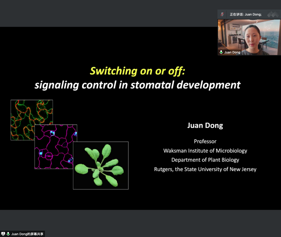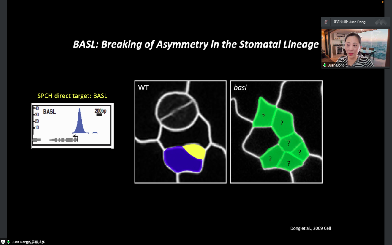 第一天的暑期課程由林辰濤老師主持,董娟老師主講。林老師向大家簡(jiǎn)要介紹了課程的歷史以及本期課程邀請(qǐng)的諸位老師及授課主題,之后董老師帶領(lǐng)大家走進(jìn)植物發(fā)育過(guò)程中的細(xì)胞生物學(xué)領(lǐng)域。上午的課程中,老師講解了植物氣孔發(fā)育的相關(guān)內(nèi)容,重點(diǎn)講解了氣孔細(xì)胞發(fā)育進(jìn)程中3個(gè)核心轉(zhuǎn)錄因子SPCH、MUTE和FAMA的發(fā)現(xiàn)過(guò)程以及作用機(jī)制, 介紹了在感知環(huán)境變化及細(xì)胞間的交流中配體與受體結(jié)合向下游傳遞氣孔發(fā)育信號(hào)的多樣性,如即使是同一個(gè)receptor,TMM,在植物不同的發(fā)育部位對(duì)氣孔發(fā)育的調(diào)控也是不同。