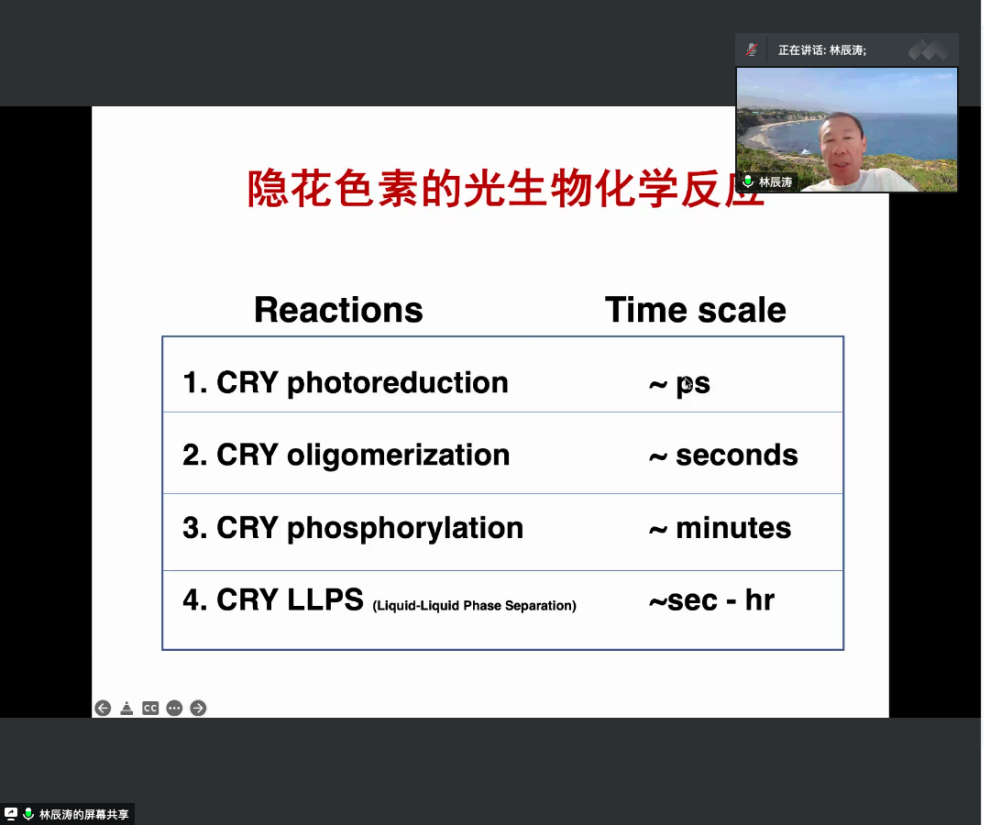 林辰濤老師從介紹植物光受體出發(fā),回顧了藍(lán)光受體的發(fā)現(xiàn)過(guò)程及其在動(dòng)植物中的不同功能,系統(tǒng)地講解了隱花色素的光還原反應(yīng)、聚合反應(yīng)、磷酸化反應(yīng)和相變反應(yīng)。