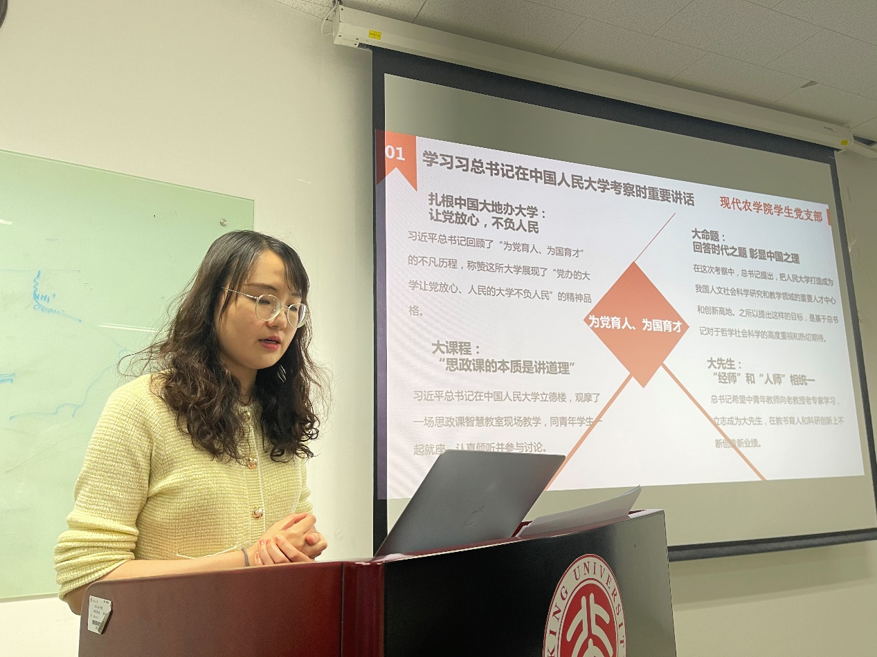 4月30日,現(xiàn)代農(nóng)學(xué)院學(xué)生黨支部、團支部開展深入學(xué)習(xí)習(xí)近平總書記在中國人民大學(xué)的重要講話精神、回顧總書記十年高校行的黨團日聯(lián)合活動,以“立足新征程,奮進新青年”為主題,深刻領(lǐng)會總書記對人才培養(yǎng)的重視和對當(dāng)代青年的殷切囑托。