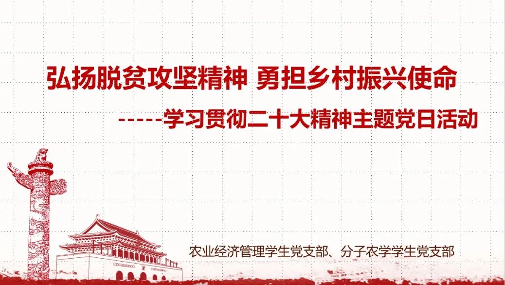為深入學習貫徹二十大精神,弘揚偉大脫貧攻堅精神,激發(fā)黨員在鄉(xiāng)村振興事業(yè)中的關鍵作用,現(xiàn)代農學院農業(yè)經(jīng)濟管理學生黨支部與分子農學學生黨支部共同舉辦學習貫徹黨的二十大精神主題黨日活動,活動以線上線下相結合的形式開展。本次活動以“弘揚脫貧攻堅精神 勇?lián)l(xiāng)村振興使命”為主題,以暑期云南實踐團成員實踐心得分享與基層干部工作經(jīng)驗分享的形式開展。活動由農業(yè)經(jīng)濟管理學生黨支部書記杜玨主持,現(xiàn)代農學院黨總支書記、副院長歐陽曉玲出席此次活動。