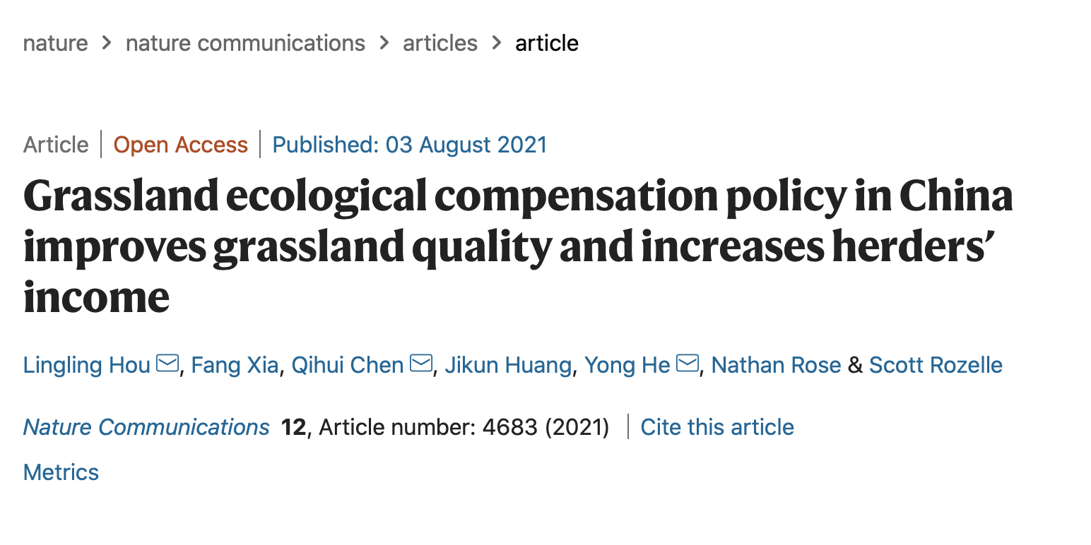 北京大學(xué)侯玲玲與合作者在《自然-通訊》發(fā)表題為“草原生態(tài)保護(hù)補(bǔ)助獎(jiǎng)勵(lì)政策實(shí)施效果”的論文2021-08-04 -